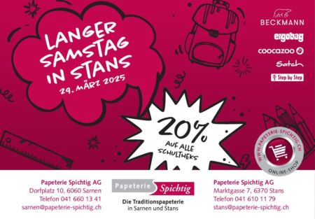 Am langen Samstag erhalten alle Kunden in Stans 20% Rabatt auf alle Schultheks von Beckmann, Ergobag, Coocazoo, Satch und Step by Step. Wir sind bis 20 Uhr für Sie da.